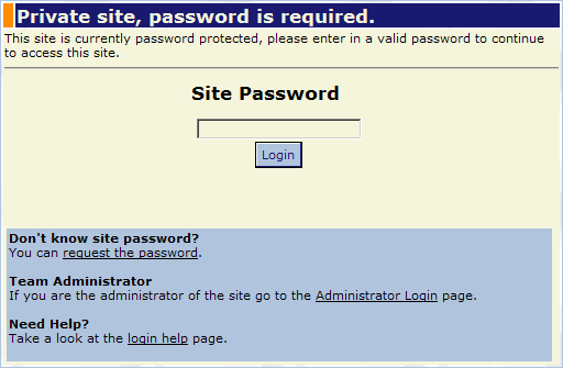If the site password is enabled by the Team Administrator, it is a single password that all visitors need to enter when visiting the site. When you first visit your site, you will be prompted for the Site Password. Just simply enter in the password, and click the Login button.